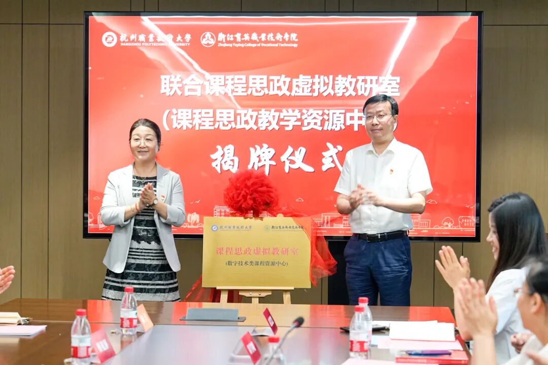 两校领导共同为联合课程思政虚拟教研室(课程思政教学资源中心)揭牌。我校信息工程学院党总支与浙江育英职业技术学院数字技术学院党总支签署联建协议。